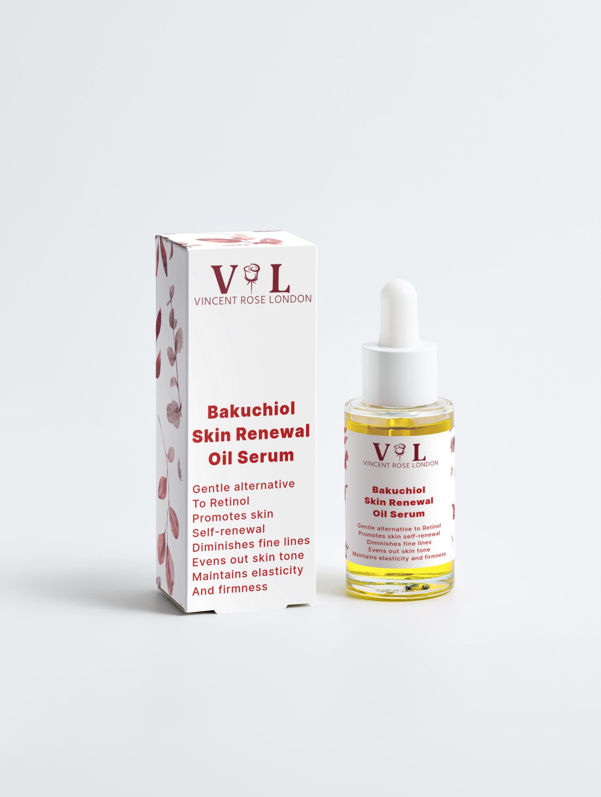 PRODUCT DESCRIPTION (30 ml) – Introducing our Bakuchiol Skin Renewal Oil Serum, a natural retinol alternative that takes your anti-ageing skincare routine to new heights. This essential serum is meticulously crafted to maintain skin elasticity, enhance firmness, and leave your skin feeling rejuvenated and velvety to the touch. Specifically designed for mature, uneven, dull, and dry skin, this luxurious elixir features Bakuchiol, renowned as a gentle retinol alternative, working harmoniously with Rosehip Seed Oil to diminish fine lines and reignite your skin's youthful glow. Immerse yourself in the elegant aroma of roses with deep spicy and woody warmth.