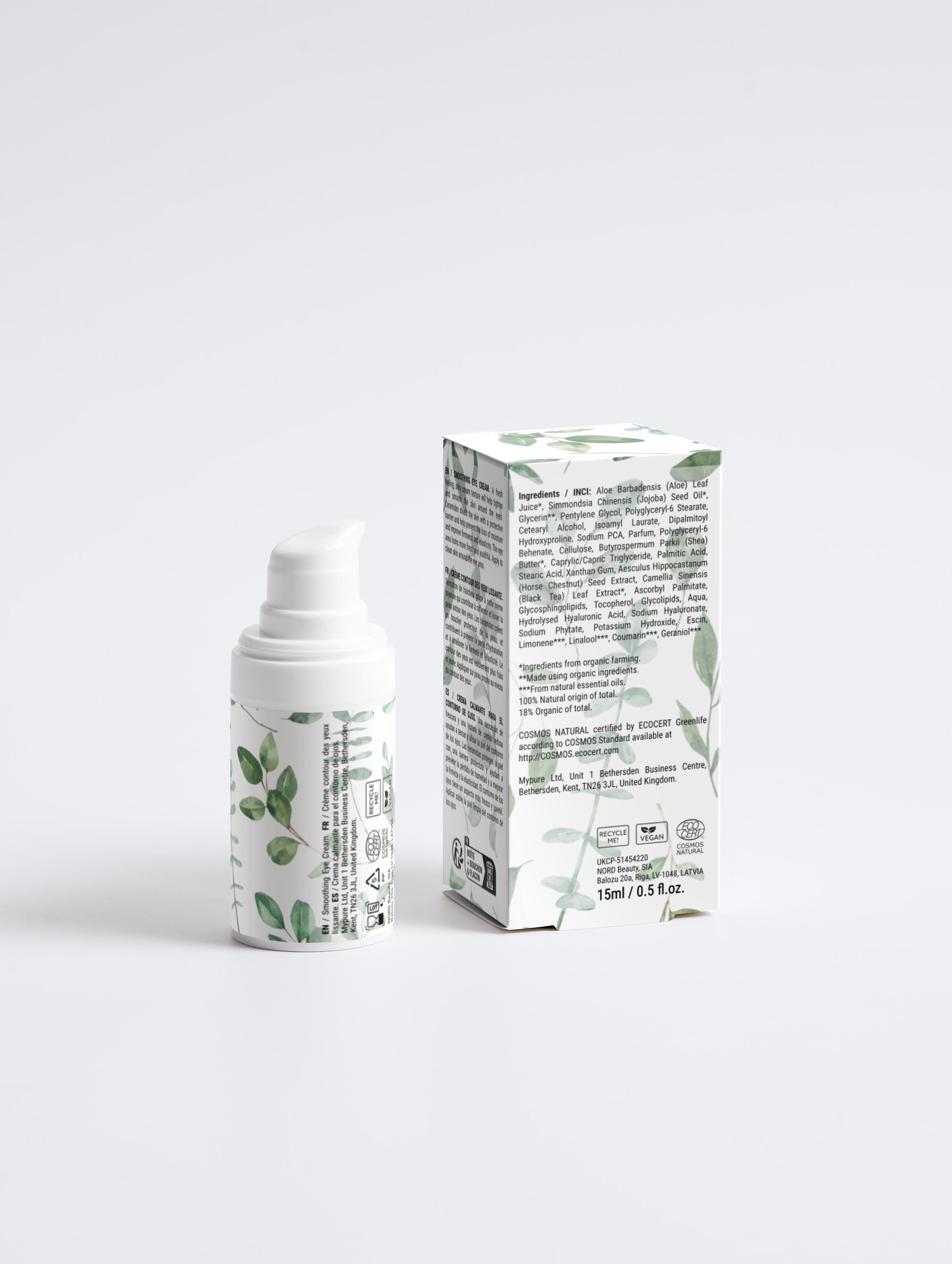 STAR FEATURES – Hydration and Moisture; the blend of Aloe Juice, Jojoba Oil, and Shea Butter provides intense hydration, helping to replenish moisture around the eyes. Hyaluronic Acid enhances water retention, promoting a plump and smooth appearance. Anti-Aging and Firming; Escin, derived from Horse Chestnut, contributes to the cream’s anti-aging properties, promoting a firmer and more lifted look. Black Tea Leaf Extract provides antioxidants that support skin elasticity. Reducing Puffiness; Escin, known for its anti-inflammatory properties, helps reduce puffiness around the eyes, contributing to a refreshed and revitalised appearance. Dark Circles and Brightening; the combination of Glycosphingolipids, Tocopherol (Vitamin E), and Ascorbyl Palmitate (Vitamin C) works to brighten the under-eye area and minimise the appearance of dark circles. Soothing and Calming; Aloe Juice, known for its soothing properties, helps calm the delicate skin around the eyes, making it suitable for individuals with sensitive skin. Lightweight; a feather-light texture that effortlessly glides on, ensuring a comfortable and refreshing experience for your delicate eye area.